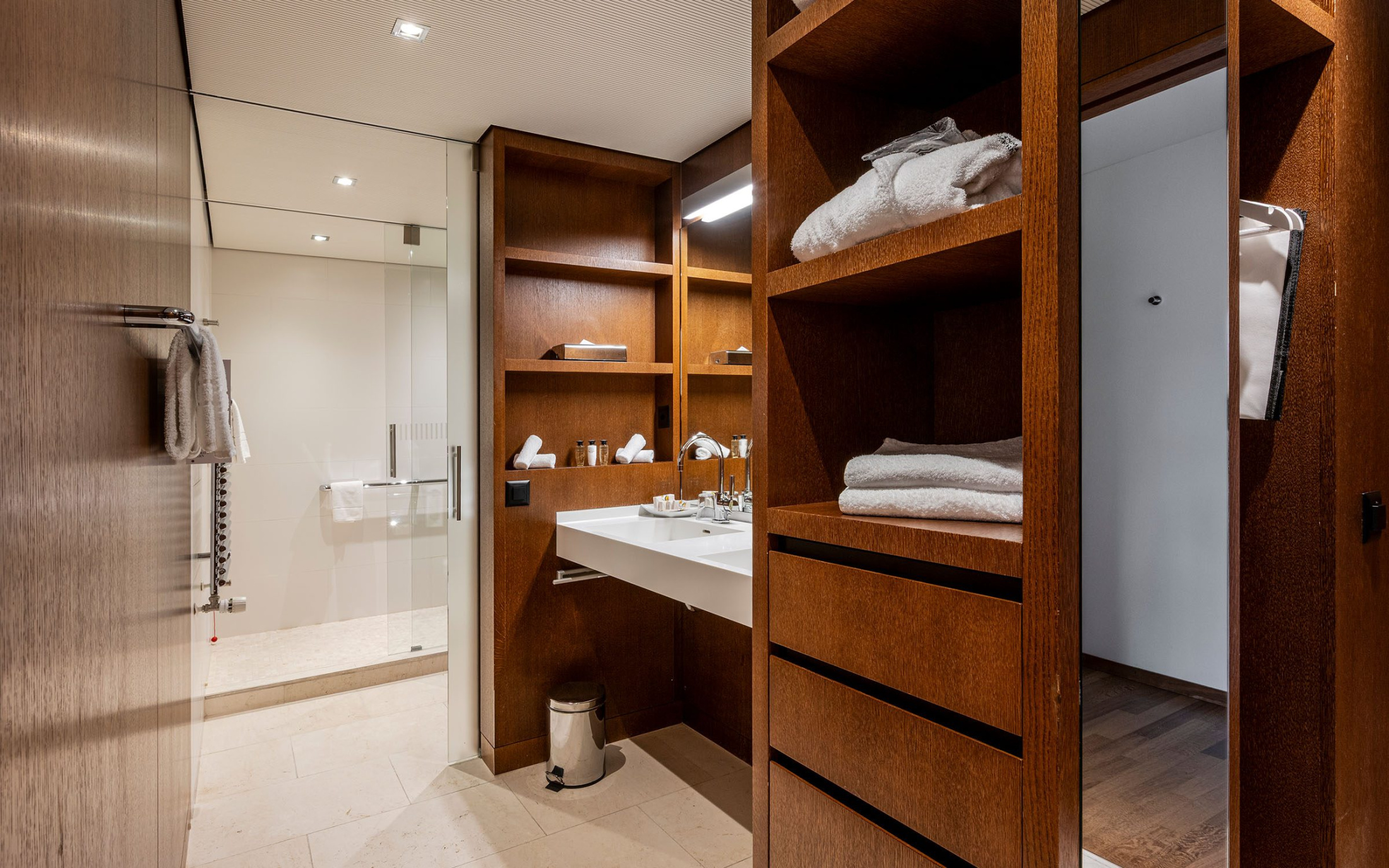 The Gerlisberg suite faces south west and boasts two balconies, as well as a kitchen with a fridge and cooker. The bathroom has a shower and two washbasins. It is possible to get out of the bed on both sides. An additional bed can be provided if necessary. Please note that the suite contains steps and is not wheelchair accessible or suitable for walking frames.